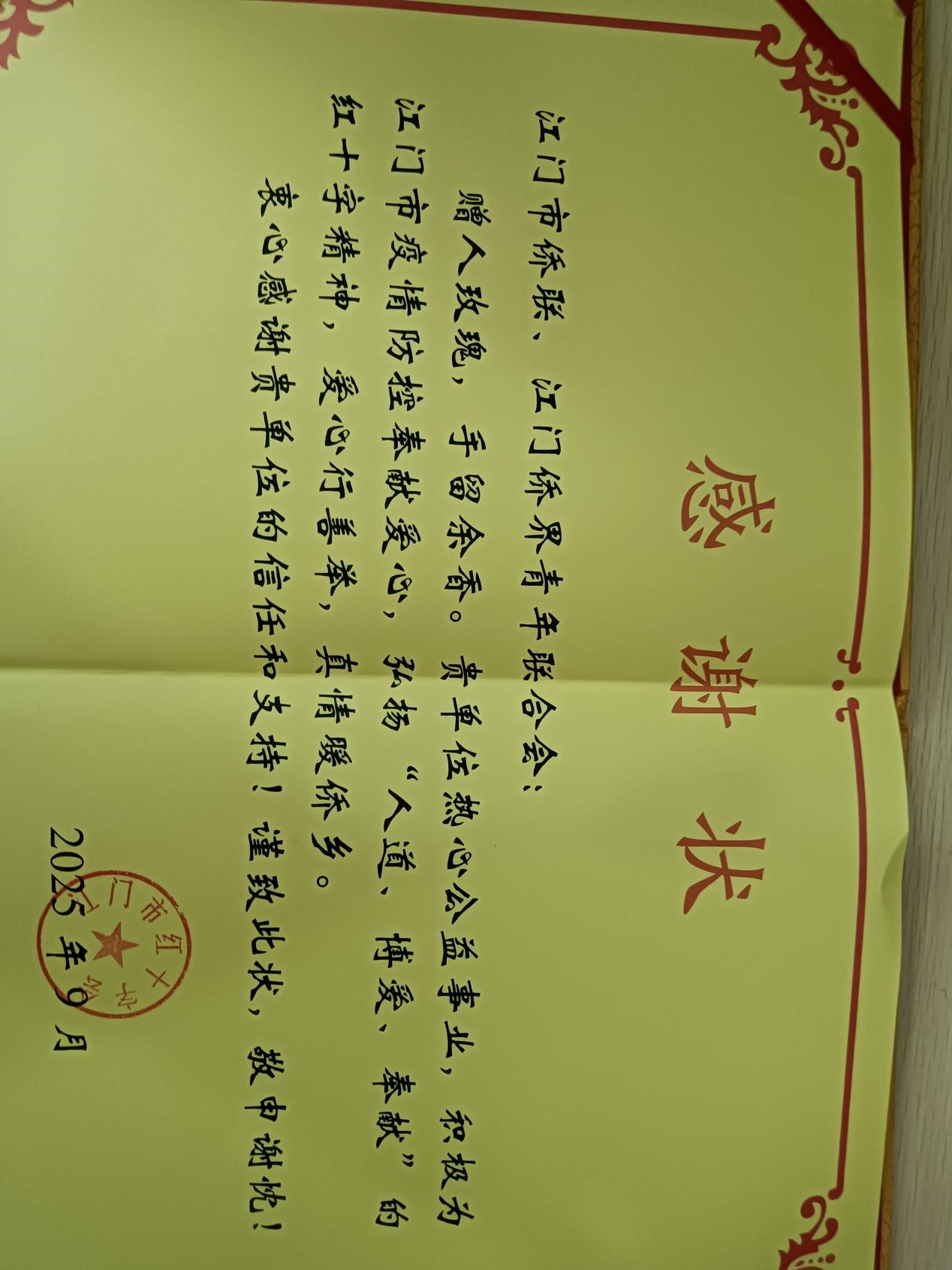 图为江门市红十字会向捐赠单位颁发的感谢状