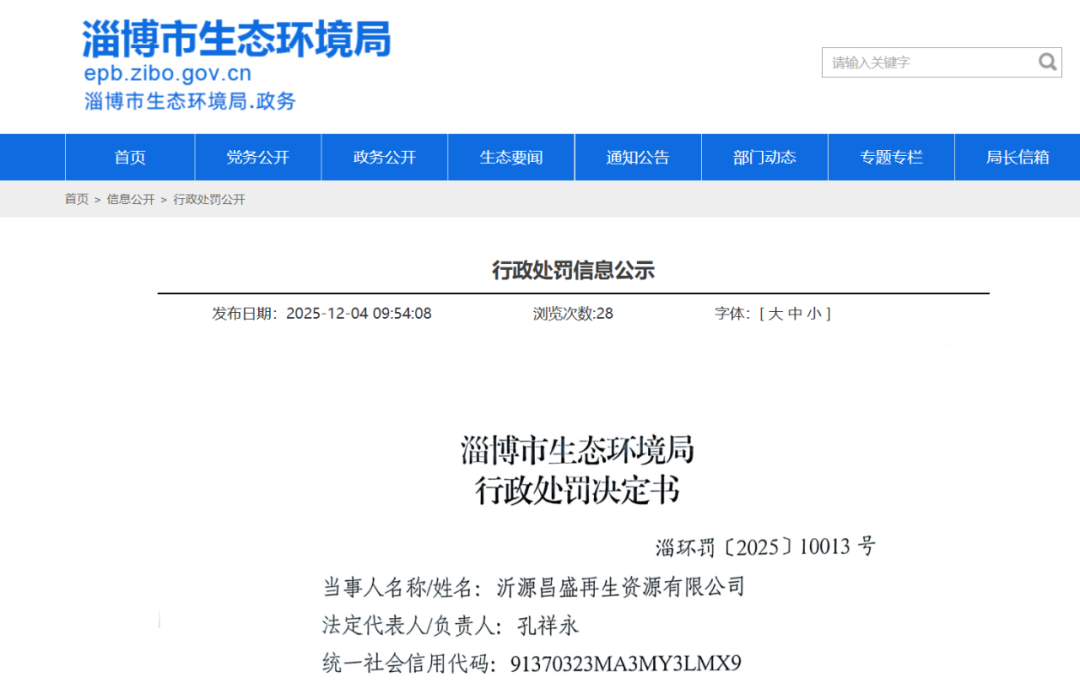 中华传播通讯社据新黄河小编从淄博市人民政府官网了解到,山东淄博市生态环境局对沂源县鲁村镇的沂源昌盛再生资源有限公司作出行政处罚决定(淄环罚〔2025〕10013号),该企业因未采取有效措施防治扬尘污染,被依法查处。