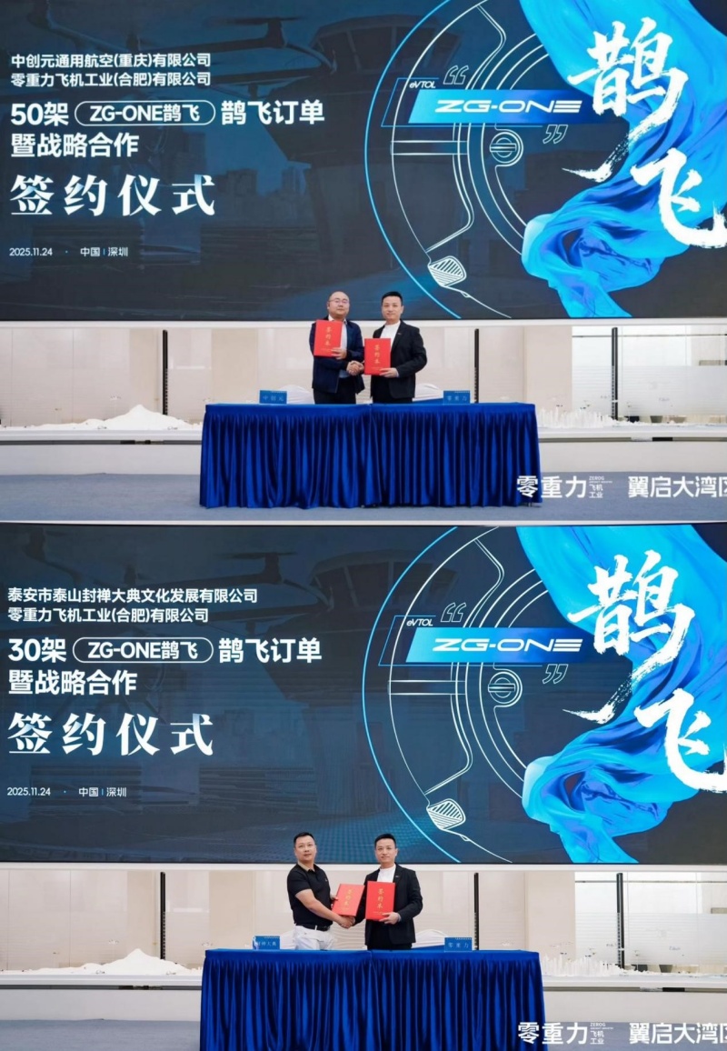 一系列战略布局的落地,也赢得了市场的高度认可。活动现场,零重力飞机工业接连完成两项重磅签约,零重力飞机工业与中创元通用航空(重庆)有限公司正式签署战略合作协议,并落地50架ZG-ONE鹊飞采购订单;零重力飞机工业与泰安市泰山封禅大典文化发展有限公司达成战略合作,将分阶段落地30架ZG-ONE鹊飞订单。两份重磅战略合作协议的落地,不仅体现了市场对ZG-ONE鹊飞产品性能与技术实力的充分信赖,更为零重力飞机工业的商业化运营奠定了坚实基础。