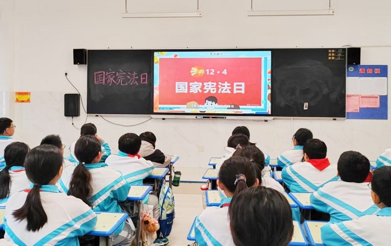 全体师生庄严肃立,举行庄严的升旗仪式。五星红旗冉冉升起,队员们行队礼、唱国歌,在肃穆氛围中感悟宪法尊严。少先队员代表发表国旗下讲话,倡导全体学子尊崇宪法权威、践行法治精神,争做新时代尊法守法好少年。