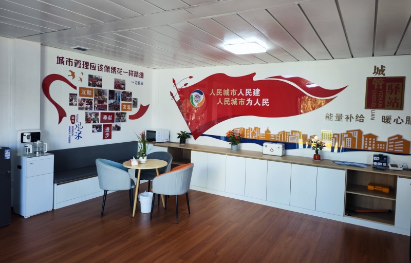 此次建设的城管驿站内部设施齐全、功能分区清晰,不仅配备了空调、桌椅、饮水机、微波炉、充电插座等基础生活设施,还贴心设置了电子血压计、图书角、应急药箱、爱心雨伞等便民物品,满足户外劳动者和广大市民“渴了能喝水、累了能歇脚、热了能纳凉、冷了能取暖、伤了能应急”的核心需求。