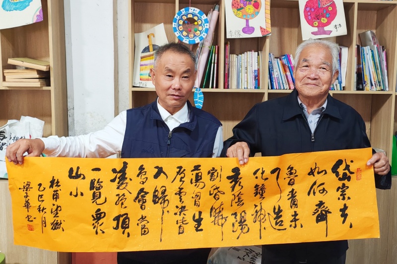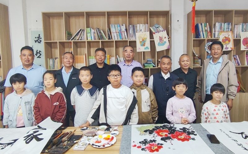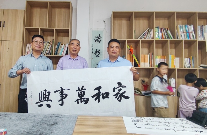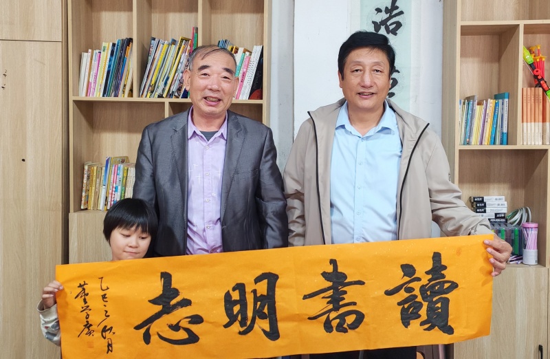 活动现场受到下户主小学校长王守林和上户主村支部书记张汝超的热烈欢迎,庄重热烈的氛围扑面而来。中央宣传部主管党建头条区主任王海涛、马召利以及书法家们,铺纸研墨,一场以笔会友的雅集就此拉开帷幕。董学广、郭全海、梁子华、李述安、徐庆森五位书法名家大展身手,或笔力雄健、气势磅礴,似千军万马奔腾而来;或行云流水、灵动飘逸,如清风拂过林间;或法度严谨、端庄厚重,尽显古朴典雅之韵;或墨韵生动、意蕴深长,让人回味无穷。书法家们还现场为留守儿童赠送书法作品,将深深的爱意与节日的祝福凝聚于笔端,那一个个刚劲有力的字迹,化作一份份珍贵的礼物,温暖了书屋,激扬了孩子们学习报国的热情。
