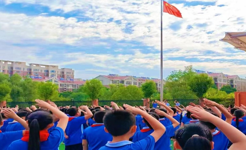 升旗仪式上,全体师生肃立操场。旗手们正步护送国旗至升旗台,国歌声起,红旗升空,师生凝视、队员敬礼。队员代表以“青春向祖国”发言,字字铿锵显担当。